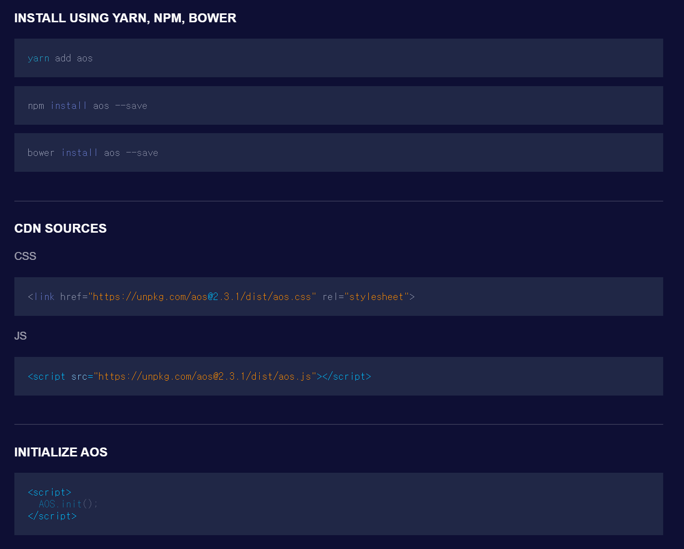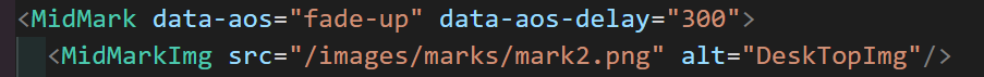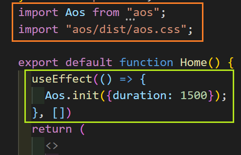 AOS 사용법이 진짜 엄청 간단해서 너무너무 맘에 드는.. 라이브러리를 발견했다. 주어진 과제의 사이트에 스크롤해서 해당 컴포넌트가 렌더 될 때 텍스트가 위로 올라오는 (fade-up) 애니메이션이 많았는데, 진짜 간단하게 적용할 수 있어서 너무 행복했던 감사한 라이브러리다. 사용법은 이게 끝이고, 밑에 깃허브를 참고하면 추가로 세팅할 수 있는 기능들이 있다. 컴포넌트를 렌더 해주는 파일에서 ( 나의 경우 next.js를 사용했고, 한 페이지뿐이라 pages > index.tsx ) 위의 코드대로, useEffect를 사용하여 aos를 페이지 전체에서 관리할 수 있도록 세팅하였다.
