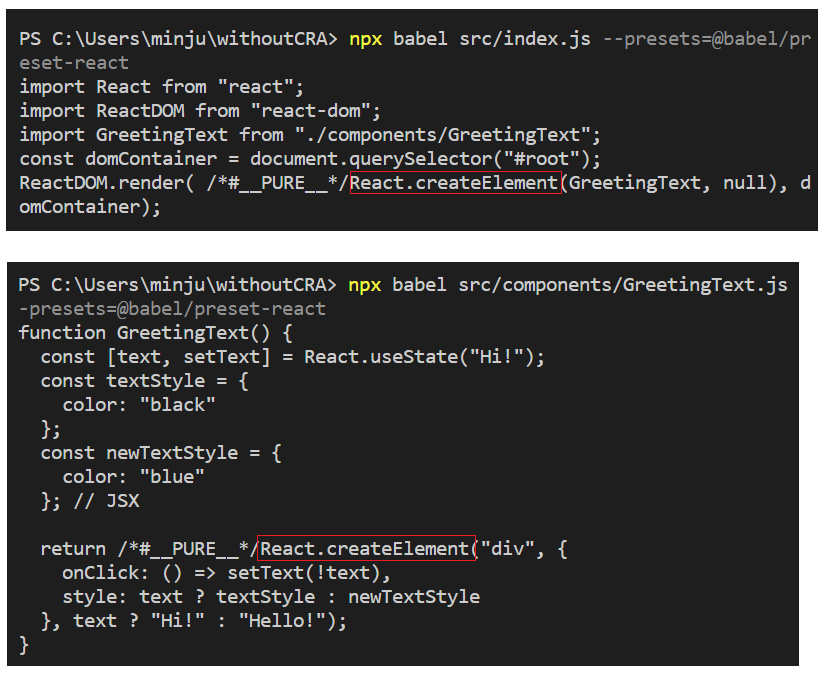npx babel 뒤에 컴파일을 원하는 파일명을 붙이고, 다운로드한 preset패키지를 --presets=@babel/preset-react를 작성해주어 해당 파일을 컴파일해보자.