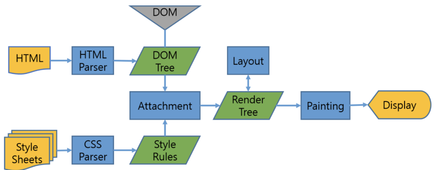 이것이 Dom Tree의 Node로 들어가고 -> attatchment함수가 호출돼서 Render Object로 바뀌고 ->