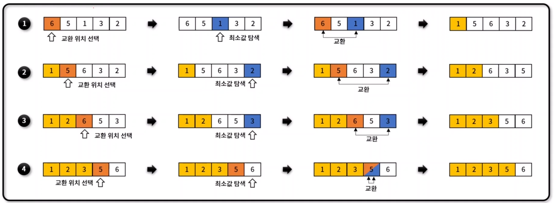 선택 정렬은 한차례를 쭉 탐색하여 비교하고, 해당하는 수를 하나 선택하여 그 하나의 수와 교환을 한다.