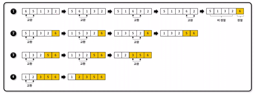 - 인접한 두 값을 비교해서 => 더 큰 값으로 교환한다.