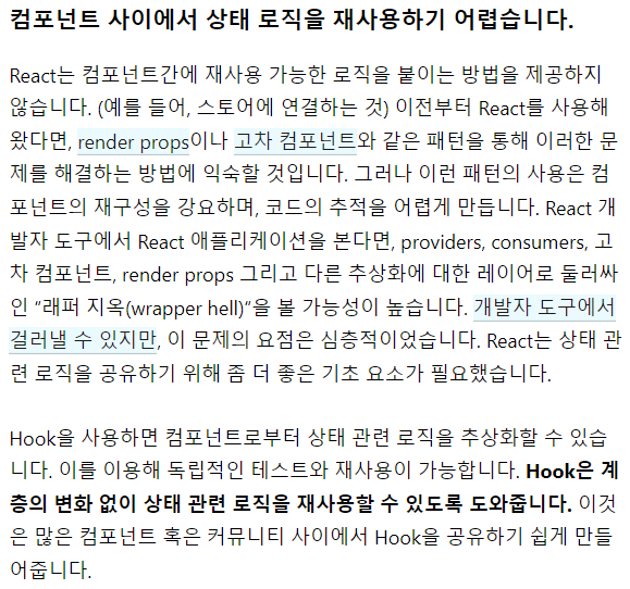 이는 불안정한 문법 제안들의 도움이 없을 시엔, 코드를 매우 장황하게 만들었다. - 이러한 문제를 해결하기 위해, Hook은 Class없이 React 기능들을 사용하는 방법을 제시한다.
