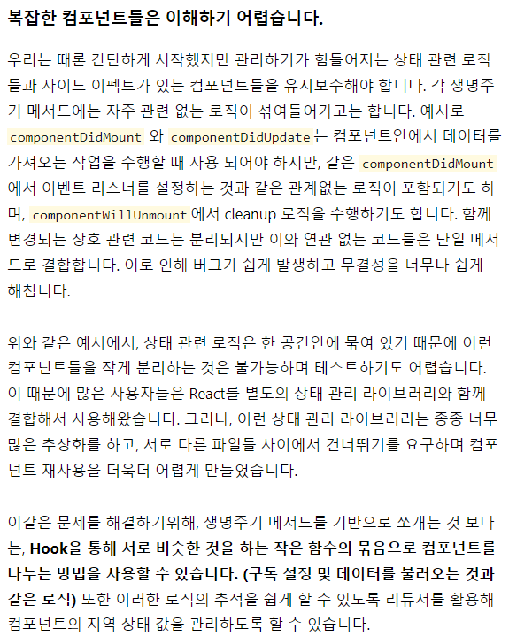 이는 불안정한 문법 제안들의 도움이 없을 시엔, 코드를 매우 장황하게 만들었다. - 이러한 문제를 해결하기 위해, Hook은 Class없이 React 기능들을 사용하는 방법을 제시한다.