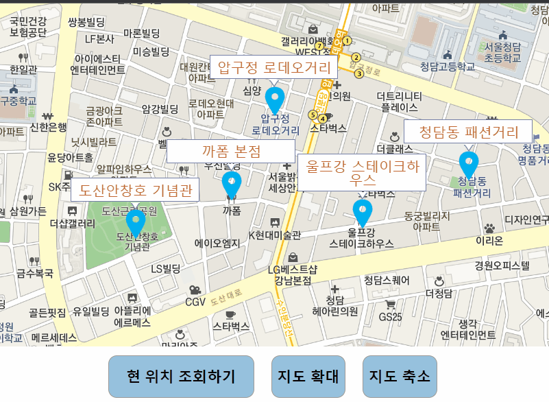 카카오 지도 api를 사용하여 서버 또는 검색창이 없는 그냥 지도 구현하는 프로젝트임으로 임의로 3곳의 mock data를 넣었다. 초기화 설정한 위도, 경도의 지도 정보를 얻어오고, 해당 data의 위치와 마커를 표시하고, zoom-in과 zoom-out을 컨트롤할 수 있는 버튼을 생성하였음.