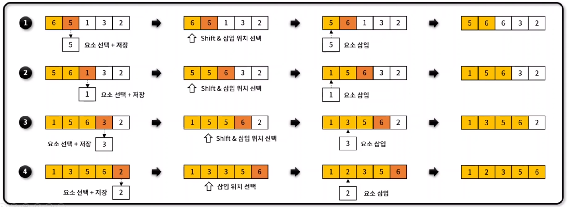 - 이미 정렬된 데이터 영역과 비교하면서, 자신의 위치를 찾아 요소를 삽입하며 정렬하는 알고리즘