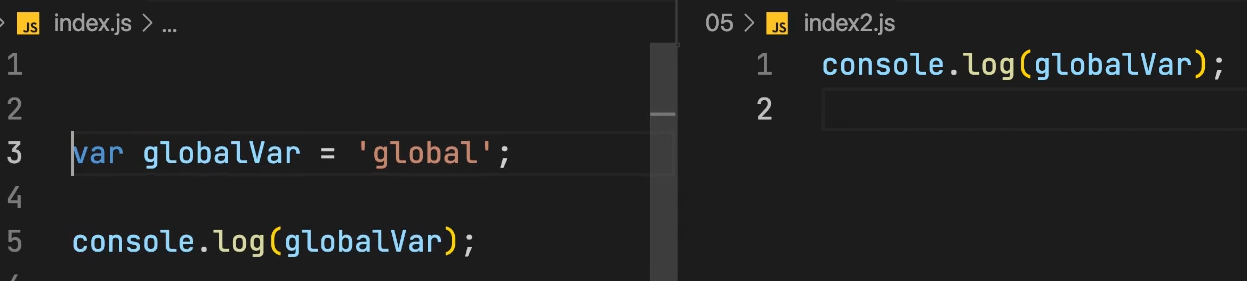 전역 공간에 변수를 생성하는 아래와 같은 경우 index.js에서도 index2.js에서도 모두 globalVar를 불러올 수 있다.