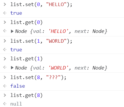 set메서드는 (1) 위치 혹은 인덱스, (2) 해당 인덱스에 위치한 노드를 업데이트할 값 등 두 개의 인자를 받는다.