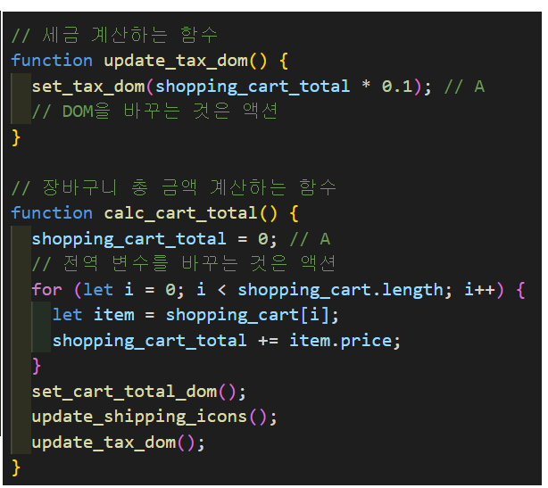 shopping_cart_total 전역 변숫값을 바꾸는 것이 출력이고, shopping_cart 전역 변숫값을 읽어오는 것이 입력이다.