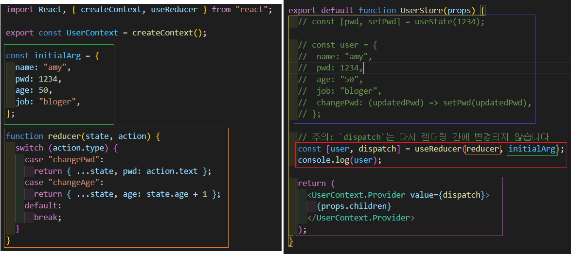 action의 type이 changeAge일 경우에는 age의 상태에 1을 더해준다. - 파란 박스 : 초기화를 해주었기에, user의 객체와 useState를 주석처리.