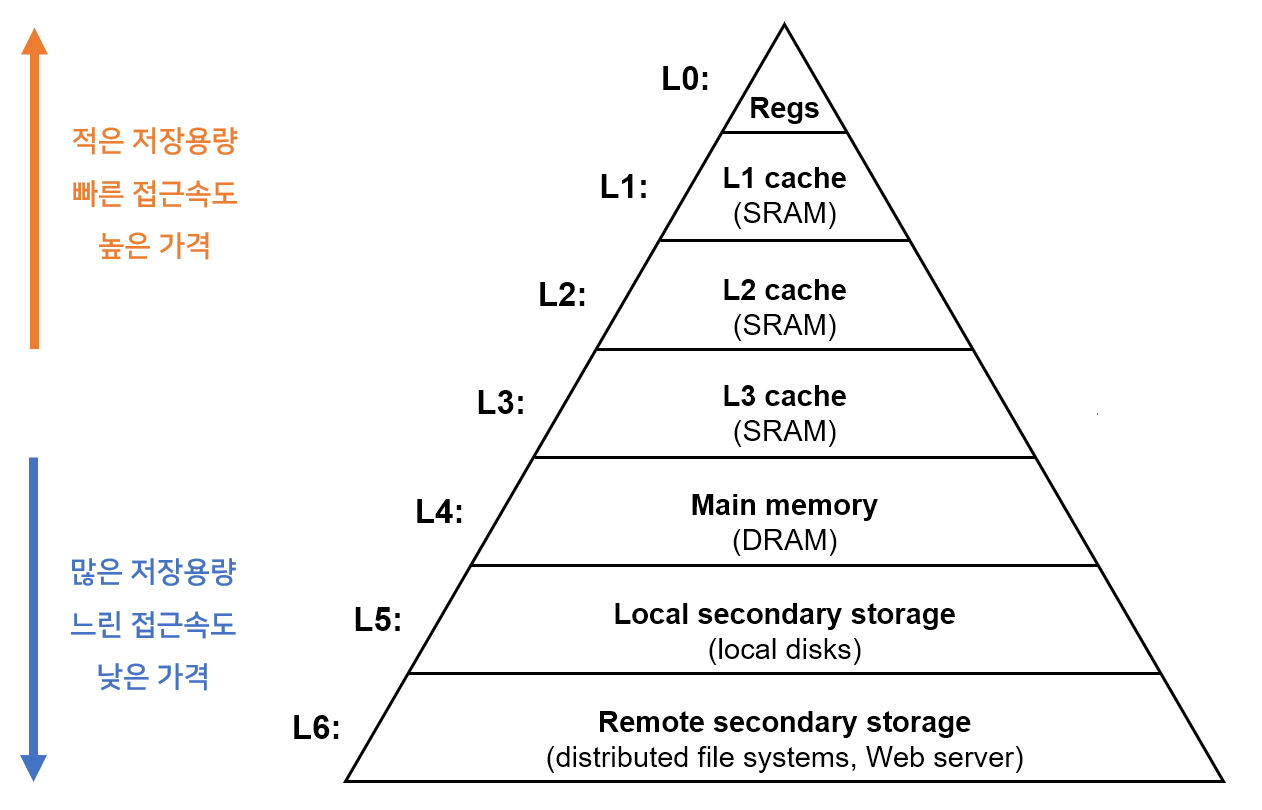 - 계층 위로 올라갈수록 가격은 비싸지는데 용량은 작아지고 속도는 빨라지는 특징이 있다.