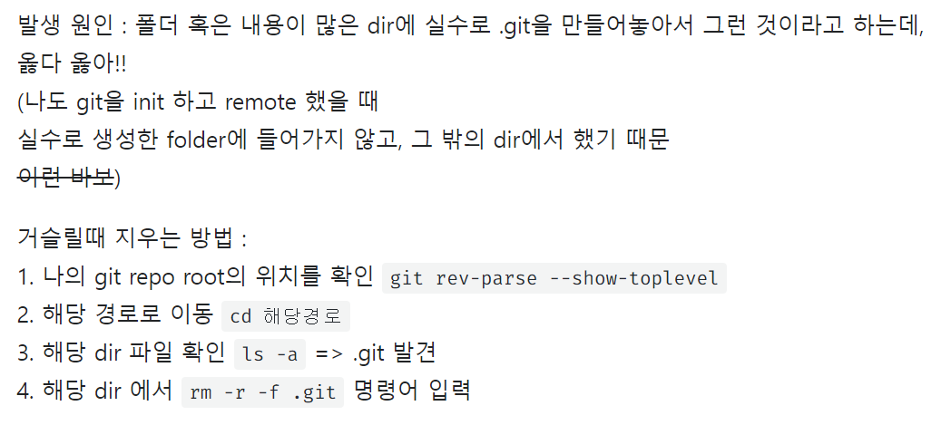 지워야 할 경로로 이동하여서 git을 삭제해야 했는데, 보존하고 싶은 경로를 들어가서 git을 삭제함ㅋㅋ글을 제대로 적어놨어야지!!! 멍청한 과거의 나 아무튼 그래서, 보존하고 싶은 경로를 삭제하고,