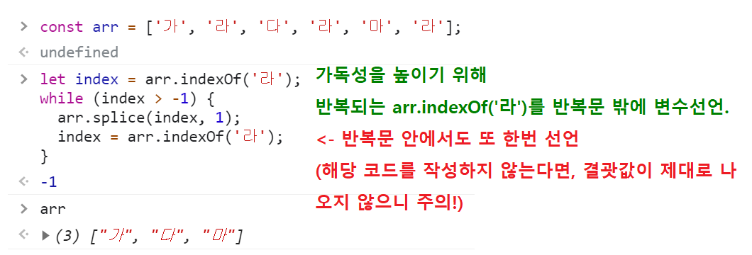 🐱👓 splice, indexOf 메서드를 이용하여 배열 arr의'라'에 해당하는 요소를 모두 제거. (반복문 사용)