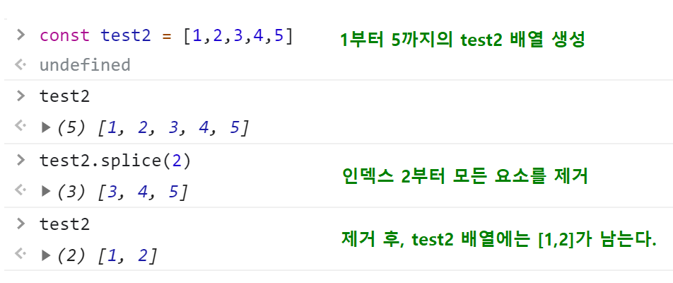 🐱👓 splice 메서드를 이용하여 배열 test2의 인덱스 2부터의 요소들을 제거.