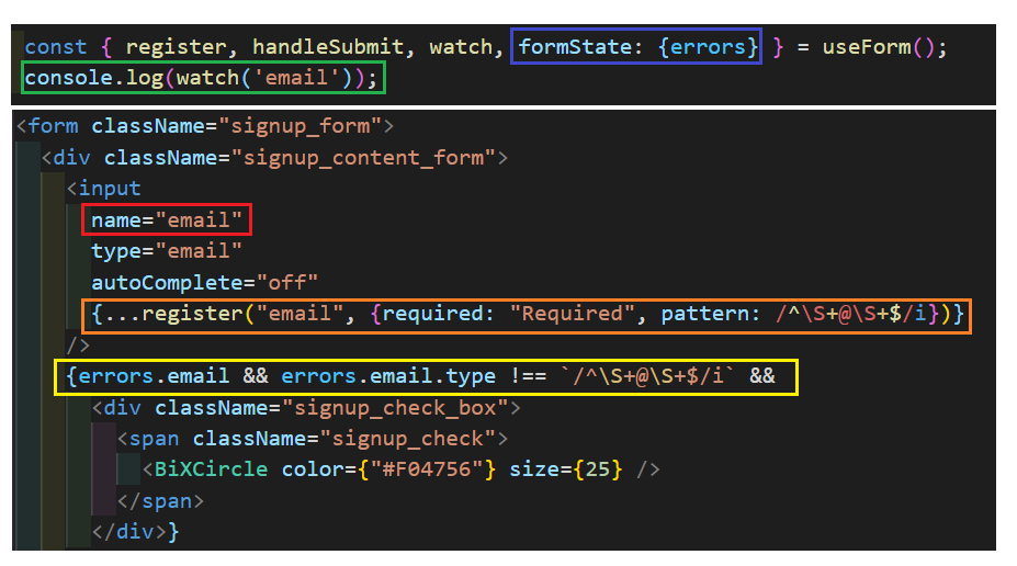 React-hook-form을 이용하여 회원가입에 필요한 from들의 유효성 체크를 해보았다.