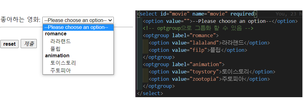 - select 태그의 자식 요소 optgroup을 사용한다면, option들을 그룹화할 수 있고, label을 추가해서 설명도 추가 가능.