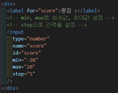 - input에 type을 number, range로 설정하고, step을 추가하여 간격 지정을 할 수 있음.