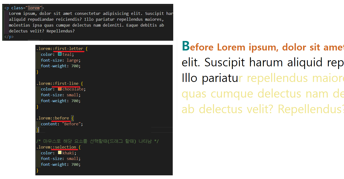 - 그리고 before, after는 content와 무조건 같이 사용해야 하는데, 원래 <p>를 보면 Lorem이 첫 단어이지만,