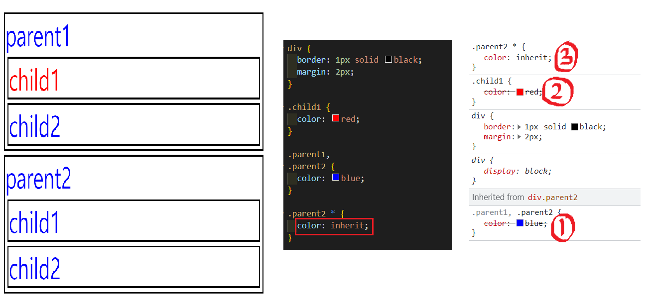 3. 하지만, 마지막에 inherit를 해줌으로써 상속받은 값들을 최우선으로 하기 때문에 color : blue;가 다시 적용되는 것임.