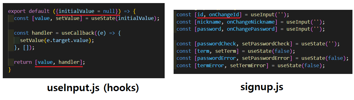 id, nickname, password는 value값, onChangeHandler에서도 변수명만 빼고 모두 같기 때문에 hooks로 빼서 커스텀화 시켜주었다. 그리고, signup.js로 가서 useInput을 import 하여, 각각의 value와 handler를 넘겨주었음.