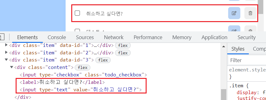 개발자 도구로 Elements를 살펴보면 label의 text값과 input의 value값은 동일함.