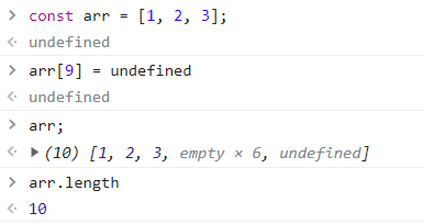 배열의 3번째부터 8번째까지 6개의 배열도 empty로 간주되어서, 결국 length는 10으로 뜬다.