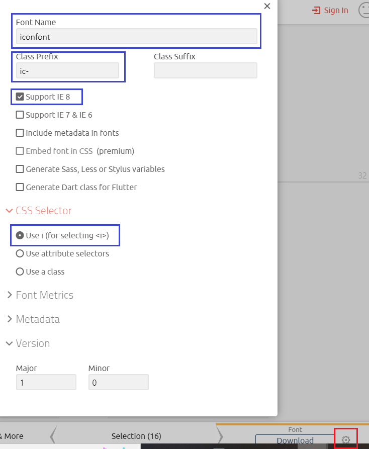 ์ค์ ํ ํ, ๋ค์ด๋ก๋ ๋ฒํผ์ ํด๋ฆญํ๋ฉด icon font ์์ฑ ์๋ฃ!