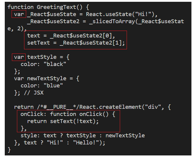 기존의 JSX문법에서는 나타나지 않았던, pure JavaScript의 문법으로 컴파일된 것을 볼 수 있음.