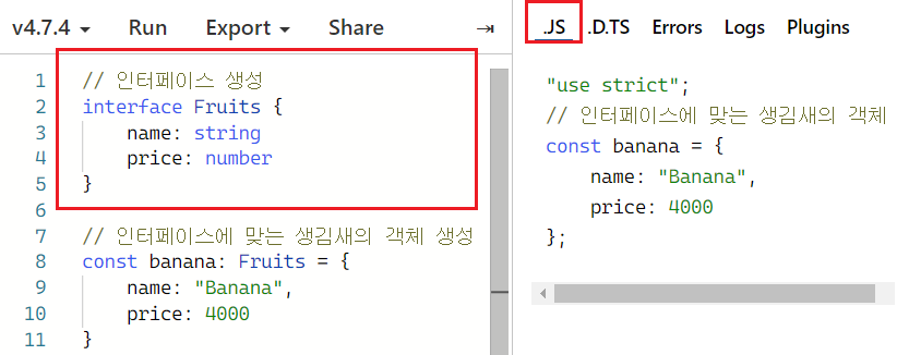 위에서 말했던 것처럼, 인터페이스는 JS에서 존재하지 않는 것을 볼 수 있다.