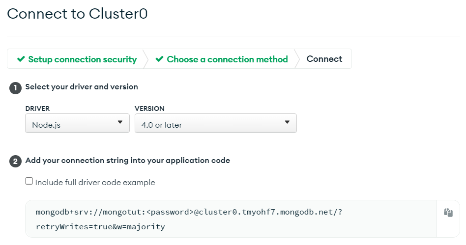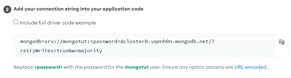 - MongoDB에서 database를 생성 후 내 app과 connect 하기 위해 해당 string을 복사 후
