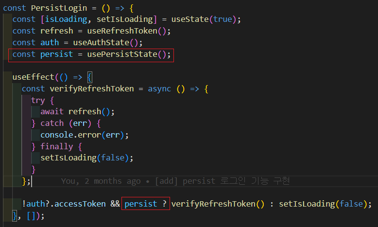 또한, 이중 삼항 연산자를 사용하여, persist와 isLoading의 유무에 따라 어떻게 return 할지에 대해 로직을 구현하였음.