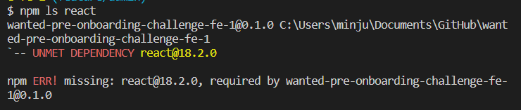 따라서, 또 다른 react 모듈이 존재하는지 알기 위해 명령어 npm ls react를 통해 다른 모듈의 유무를 확인하였고,