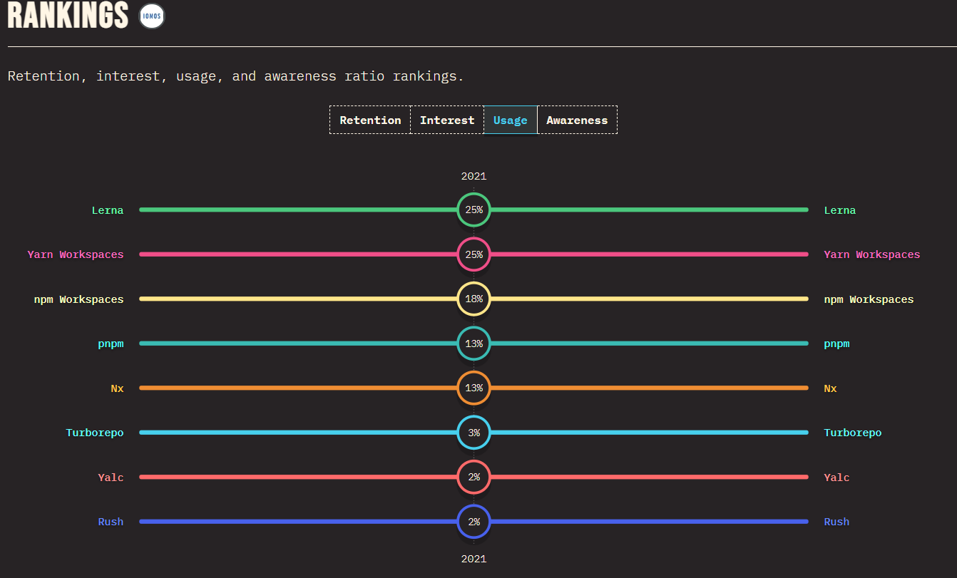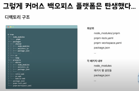Lerna, Yarn, npm, pnpm, Nx 등이 많이 사용되었다.