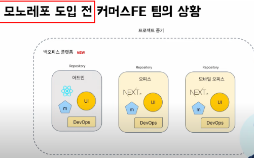 - 관리 포인트 증가 : 늘어난 프로젝트 저장소의 수만큼 관리 포인트가 늘어난다. 린트, 테스트, 개발 모드 실행, 빌드, 게시, 배포 등의 과정을 저장소의 수만큼 반복해야 한다.