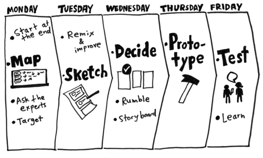 5일 만에 "아이디어 -> 스케치 -> 설루션 -> 프로토타입핑 -> 고객 테스트"까지 완료하는 과제 해결법이다.