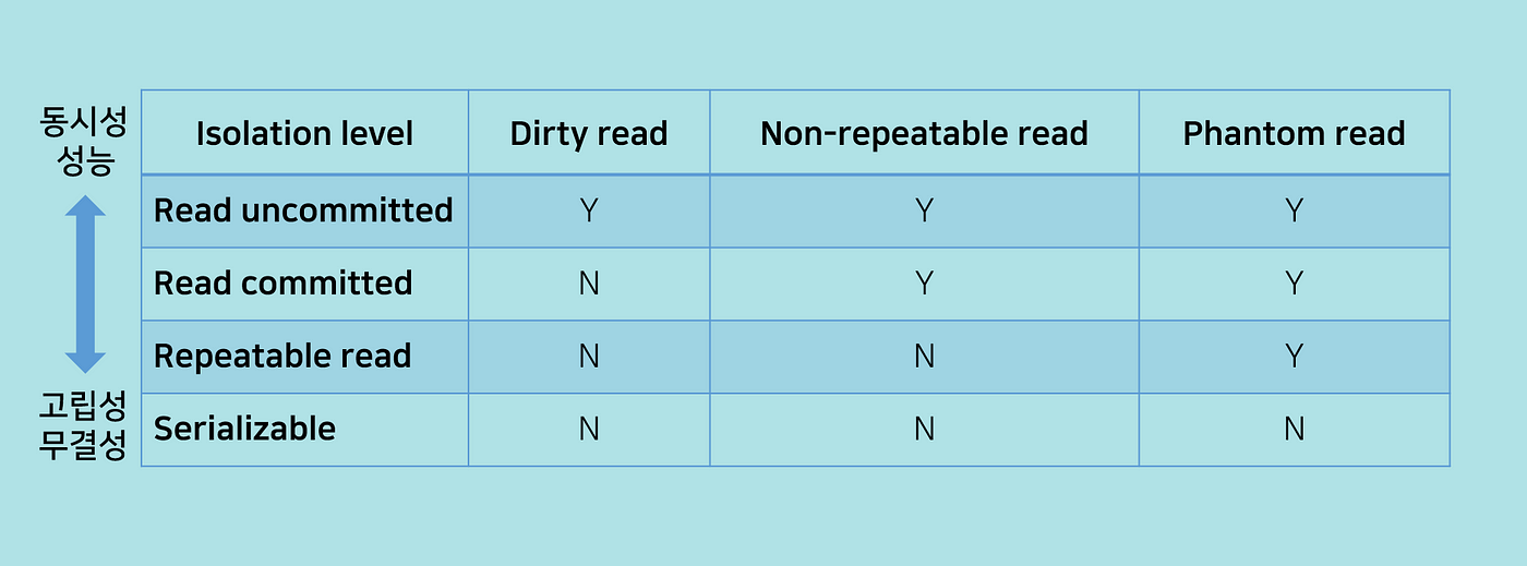 - 위로 갈수록 동시성이 강해지지만 격리성은 약해지고, 아래로 갈수록 동시성은 약해지고 격리성은 강해진다.