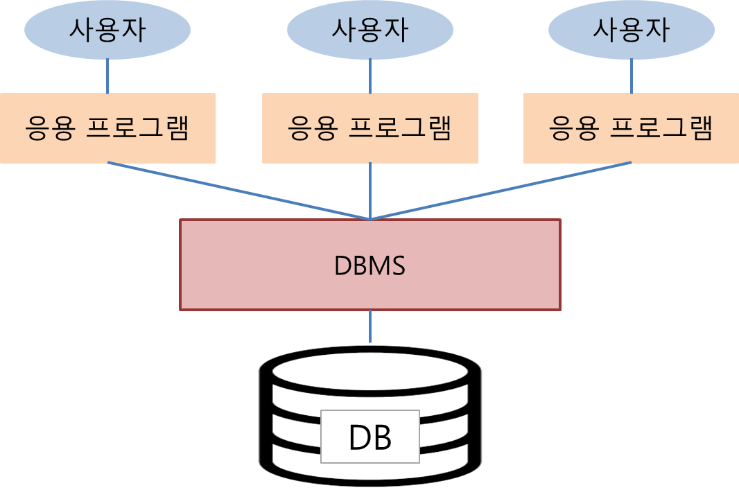 데이터베이스 위에 DBMS가 있고, 그 위에 응용 프로그램이 있다.