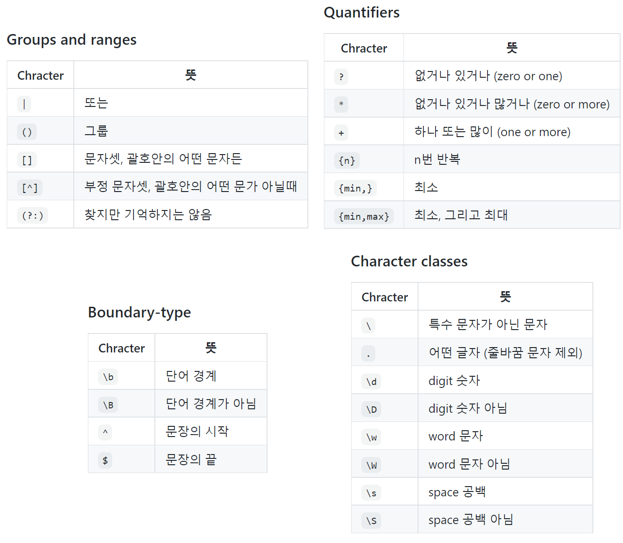 ※ 정규표현식 더 알아보기 : https://github.com/ziishaned/learn-regex